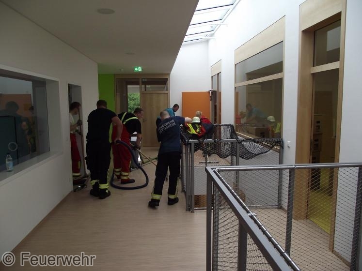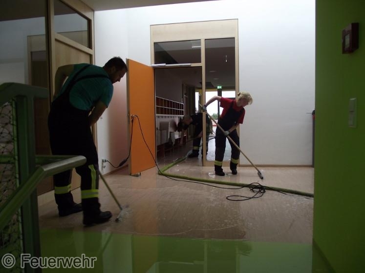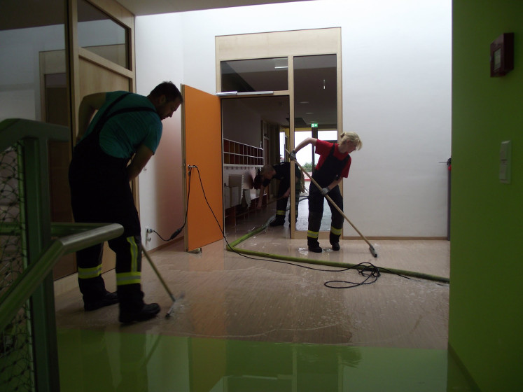 Das Wasser wurde mit Wassersauger entfernt und Teile der Einrichtung in die angrenzende Turnhalle gebracht.