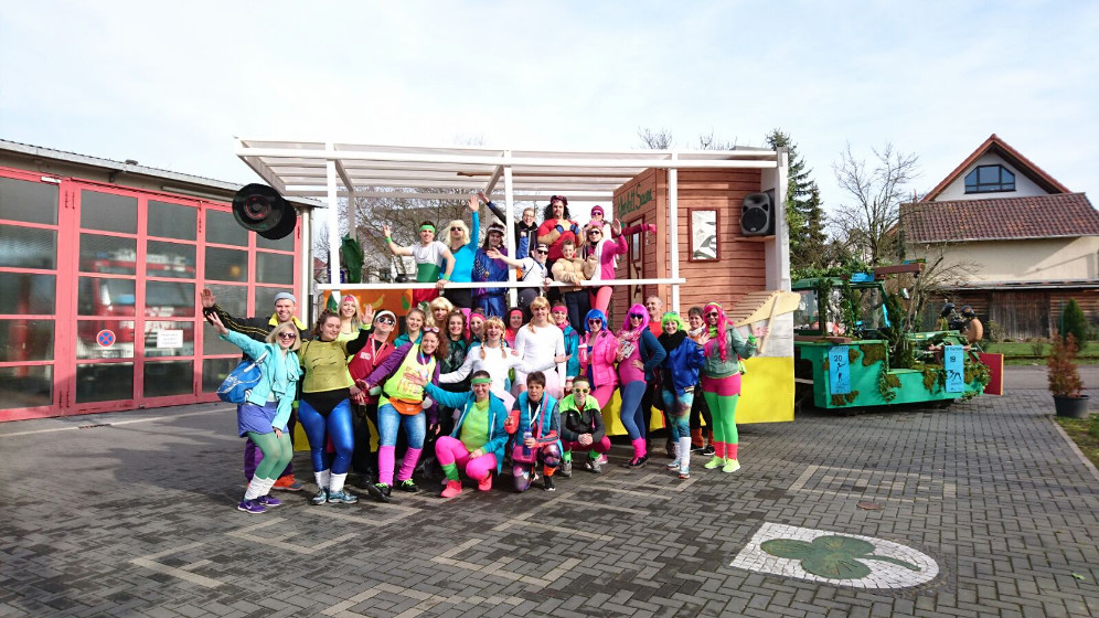 Am nächsten Tag stand der Großwettkampf in Östringen an. Früh trafen sich die Athleten um sich ausreichend warm zu machen und für den Umzug auf den Punkt volle Leistung abrufen zu können. Zu Hits wie „Call on me“ zeigten die Aerobicdamen rund um Nicole Zahn eine beeindruckende Performance. Insbesondere die Athleten in der Disziplin Ausdauersport besuchten am Abend noch den Maskenball des Heimatvereins.